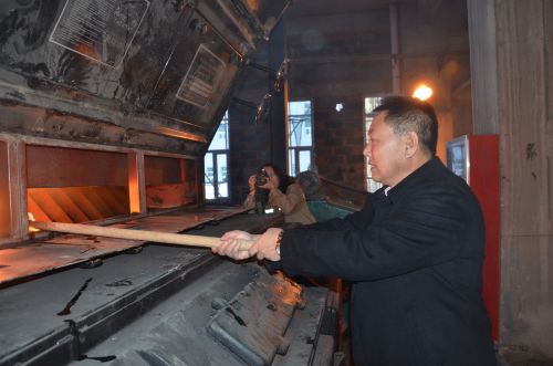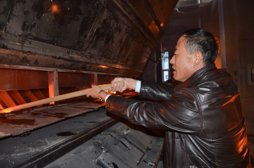 (城發(fā)公司副總經理梁永慶,手持火把密切關注爐膛內火焰燃燒的態(tài)勢。李波攝)