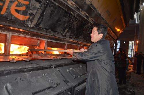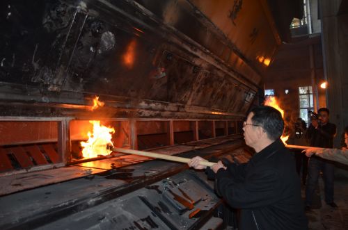 (城發(fā)公司副總經理史繼文將熊熊燃燒的火把放入爐內,