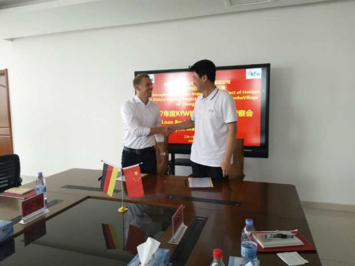 城發(fā)公司副總經理吳利勤向考察團一行詳細介紹了項目進展、環(huán)境保護、設備采購和計劃投資等方面情況,并對考察團提出的問題進行了詳細認真回答。隨后吳利勤副總經理全程陪同考察團實地考察橋靠、三合村熱源廠鍋爐車間和部分熱力站;7月18日上午與德國復興信貸銀行(KFW)項目經理Julian Schuetz先生簽訂了此次檢查調研備忘錄。考察團對城發(fā)及當前項目的建設實施情況給予了充分肯定和高度評價。