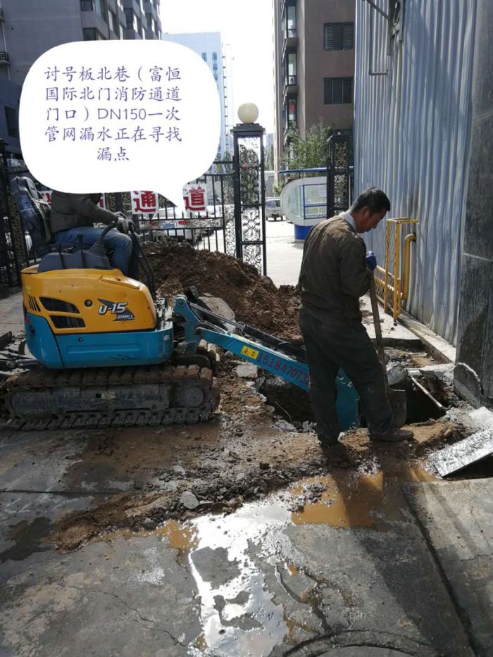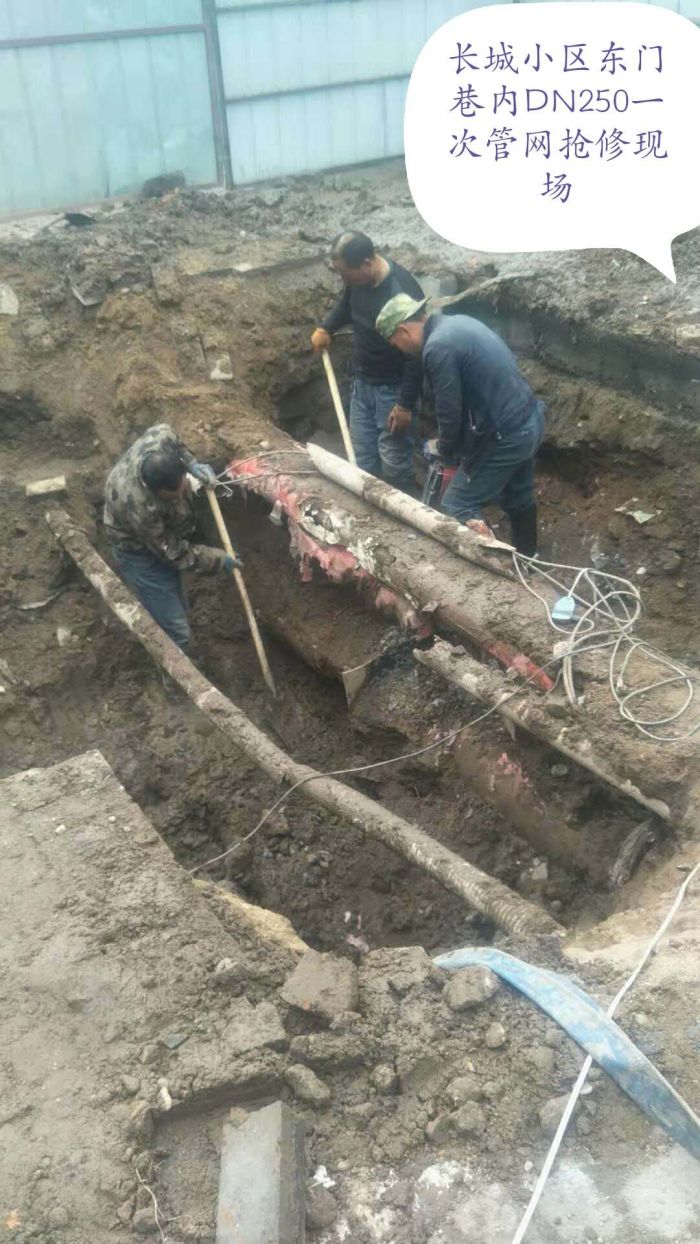 9月29日,管網(wǎng)公司接到辛家營供熱分公司搶修通知,騰飛南路如意廣場環(huán)形路口北側(cè)東綠化帶中發(fā)現(xiàn)一處冒水現(xiàn)象。管網(wǎng)公司領(lǐng)導高度重視,迅即安排人手,查找漏水點。他們憑借豐富的搶修經(jīng)驗,決定采用十字釘,直架設(shè)于涵管之上,創(chuàng)造人工作業(yè)通道,根據(jù)涵管內(nèi)水流方向判斷,搶修人員在胸腹部綁上滑板及護具,在DN600熱力管道中向西滑行50米左右,終于發(fā)現(xiàn)了漏水點。為了給供暖投運工作贏取時間,參與搶修的20余人輪班作業(yè),連續(xù)奮戰(zhàn)7個晝夜,10月6日,圓滿完成搶修任務(wù)。