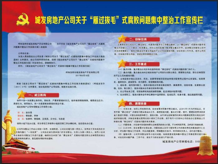從5月開(kāi)始,按照市委市政府要求,城發(fā)公司開(kāi)展了“雁過(guò)拔毛”式腐敗問(wèn)題集中整治工作,公司高度重視集中整治的宣傳和自查工作,并將其作為集中整治“雁過(guò)拔毛”式腐敗問(wèn)題的重要任務(wù),精心組織、迅速行動(dòng),總公司制訂了《城發(fā)公司關(guān)于“雁過(guò)拔毛”式腐敗問(wèn)題集中整治工作宣傳方案》,各分子公司都結(jié)合自身實(shí)際制訂了可操作性強(qiáng)的宣傳方案,讓廣大職工群眾知曉并支持,參與集中整治。公司通過(guò)總公司及分子公司各級(jí)網(wǎng)站、微博、微信公眾號(hào)、微信群、LED大屏幕、LED條屏、噴繪宣傳板、條幅、宣傳欄、動(dòng)員會(huì)議面對(duì)面宣傳等10多種載體和形式,30多幅宣傳內(nèi)容認(rèn)真進(jìn)行了宣傳,確保把集中整治“雁過(guò)拔毛”式腐敗問(wèn)題工作深入宣傳至一線干部職工中,讓廣大干部職工及群眾充分了解并參與到宣傳工作中,通過(guò)廣大干部職工將宣傳活動(dòng)輻射到千家萬(wàn)戶,提高了社會(huì)群眾對(duì)集中整治“雁過(guò)拔毛”式腐敗問(wèn)題工作的知曉度。