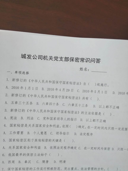 還集中進行了保密教育。為進一步推動保密和密碼工作現(xiàn)行方針、政策、法律法規(guī)學習宣傳活動,增強廣大黨員干部群眾的保密意識、保密法制觀念和強化密碼法的學習宣傳,黨支部通過發(fā)放解答“城發(fā)公司機關黨支部保密常識問答”100題的考卷,進行了“忠誠干凈、踐行使命,法在心中、法在行中”為主題的《保密法》《密碼法》宣傳教育。